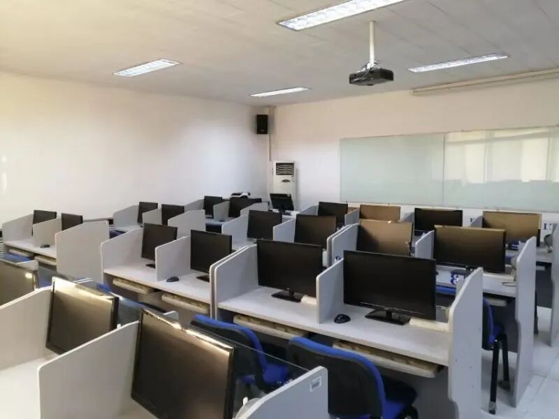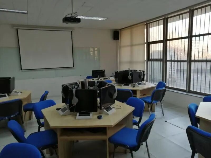 我院拥有全数字多媒体语言实验室2间,占地119平方米,可供各外语类专业教学与语言实训使用。语音实验室是按照应用型人才培养教育的教学要求设置的教学场所。外语专业学生在语言实验室学习听力、会话、翻译等专业相关课程,以及语音拓展训练、视听说拓展训练等小学期实践课程。