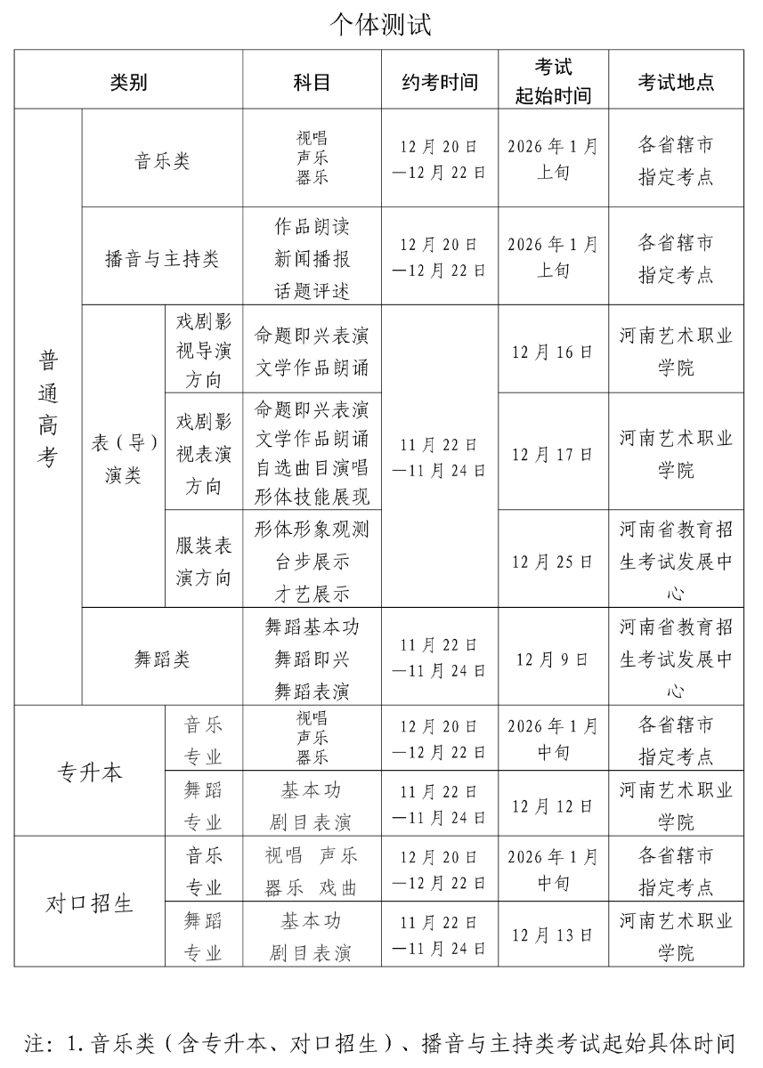 一、静心做好考前准备。请全省艺术类考生认真阅读河南省教育考试院官方网站(https://www.haeea.cn)发布的相应考试说明,普通高考艺术类考生请认真阅读《河南省2026年普通高校招生艺术类专业考试有关事宜的说明》与各专业科类省级统考考试要求及注意事项,专升本艺术类考生请认真阅读《河南省教育考试院发布2026年普通高等学校专升本考试招生工作实施办法》与相关专业考试说明,对口招生艺术类考生请认真阅读《河南省2026年普通高等学校对口招收中等职业学校毕业生工作相关事宜问答》与相关专业考试说明。具体考试时间安排附后,请考生提前熟悉各专业考试规则,合理规划考前学习和生活,注意饮食、作息和自身安全,保持良好身心状态,自信迎接考试。