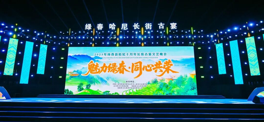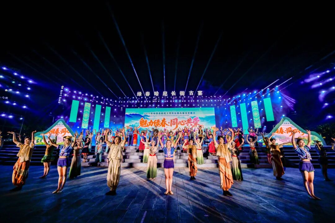 滇池学院与中国海洋大学、包头师范学院、华南师范大学音乐学院、河北大学艺术学院、红河学院等10家高校、230名师生参与晚会演出、长街民族风情巡游、长街古宴文化互动。文艺晚会以“魅力绿春·同心共荣”为主题,通过“绿水青山・古韵新风”“多彩家园・民族和鸣”“同心筑梦・时代华章”“团结花开・共赴新程” 四大章节的设计,构建起“自然基底—文化交融—时代担当—未来展望”的脉络,既扎根绿春本土文化,又呼应民族发展大局,蕴含着独特的内涵与深意,勾勒出一幅自然与人文交融、传统与现代碰撞、民族与时代共鸣的壮美画卷。