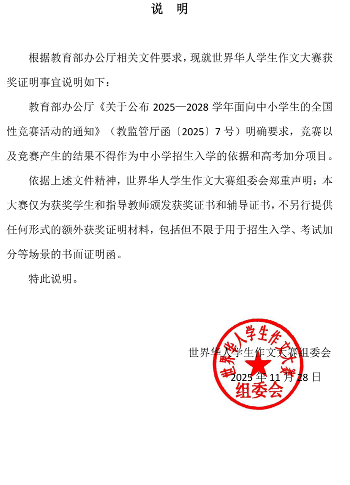 关于世界华人学生作文大赛获奖证明事宜的说明