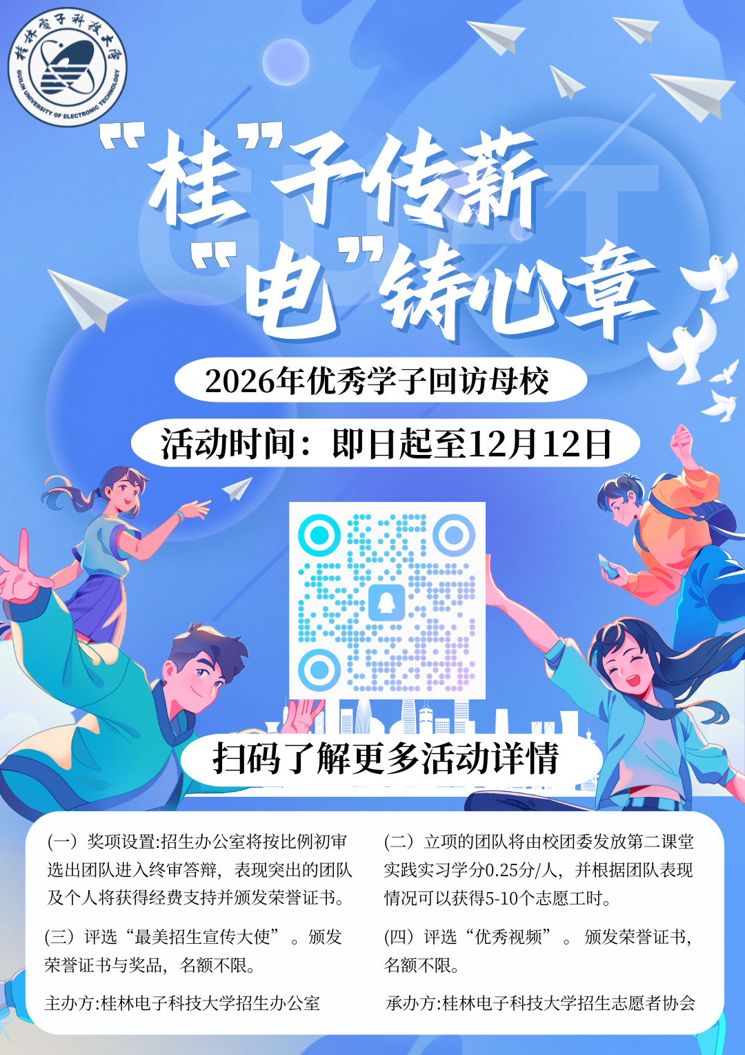 暖冬携暖意,归巢叙温情。当冬日的寒风掠过校园,那些藏在高中岁月里的师生情谊、同窗记忆,愈发清晰动人。值此暖冬时节,桂林电子科技大学招生志愿者协会在此发起2026年优秀学子回访母校招生宣传活动,诚邀每一位桂电学子,带着大学的成长与收获,回到梦开始的地方,赴一场暖冬里的青春之约。