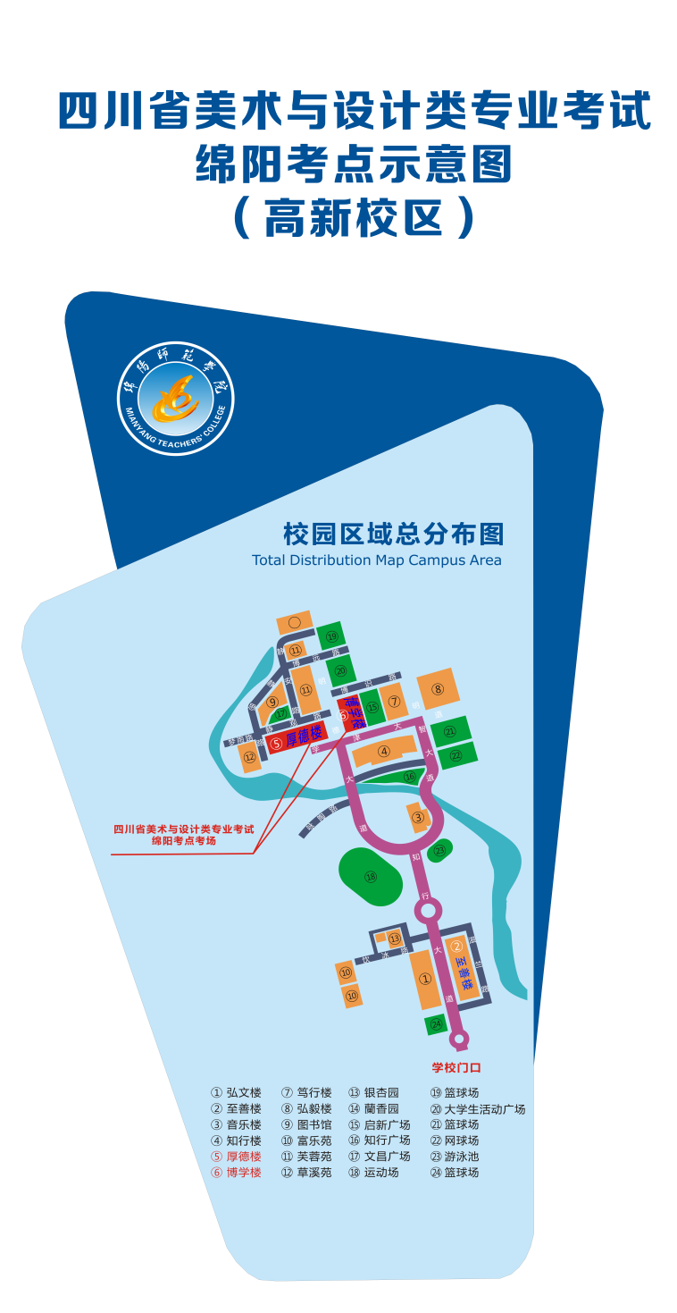 附:四川省2026年普通高校招生美术与设计类专业统考绵阳考点及考场分布示意图: