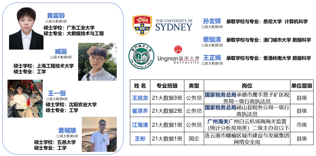本专业毕业生就业质量持续走高,升学与就业双轨并行。2025届毕业生考研方向覆盖国内外知名院校,既有广东工业大学、上海工程技术大学等内地高校的大数据技术与工程等优势专业,也有悉尼大学、澳门城市大学等港澳及海外名校的数据科学硕士项目。考公与国企就业表现亮眼,毕业生成功入职国家税务总局、广州海关等单位,或进入国企从事网络安全等核心岗位,职业稳定性拉满。