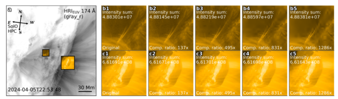 论文中还展示了该算法在不同太阳距离、不同观测分辨率下的性能稳定性。研究表明,SolarZip在数据压缩的同时,仍能精准保留太阳喷流(jet)、日珥(prominence)等微小结构特征,其误差甚至低于仪器自身的测量噪声。换言之,这一技术突破不仅节省了宝贵的深空通信资源,更为未来的大规模天文观测任务和实时科学分析提供了全新可能。
