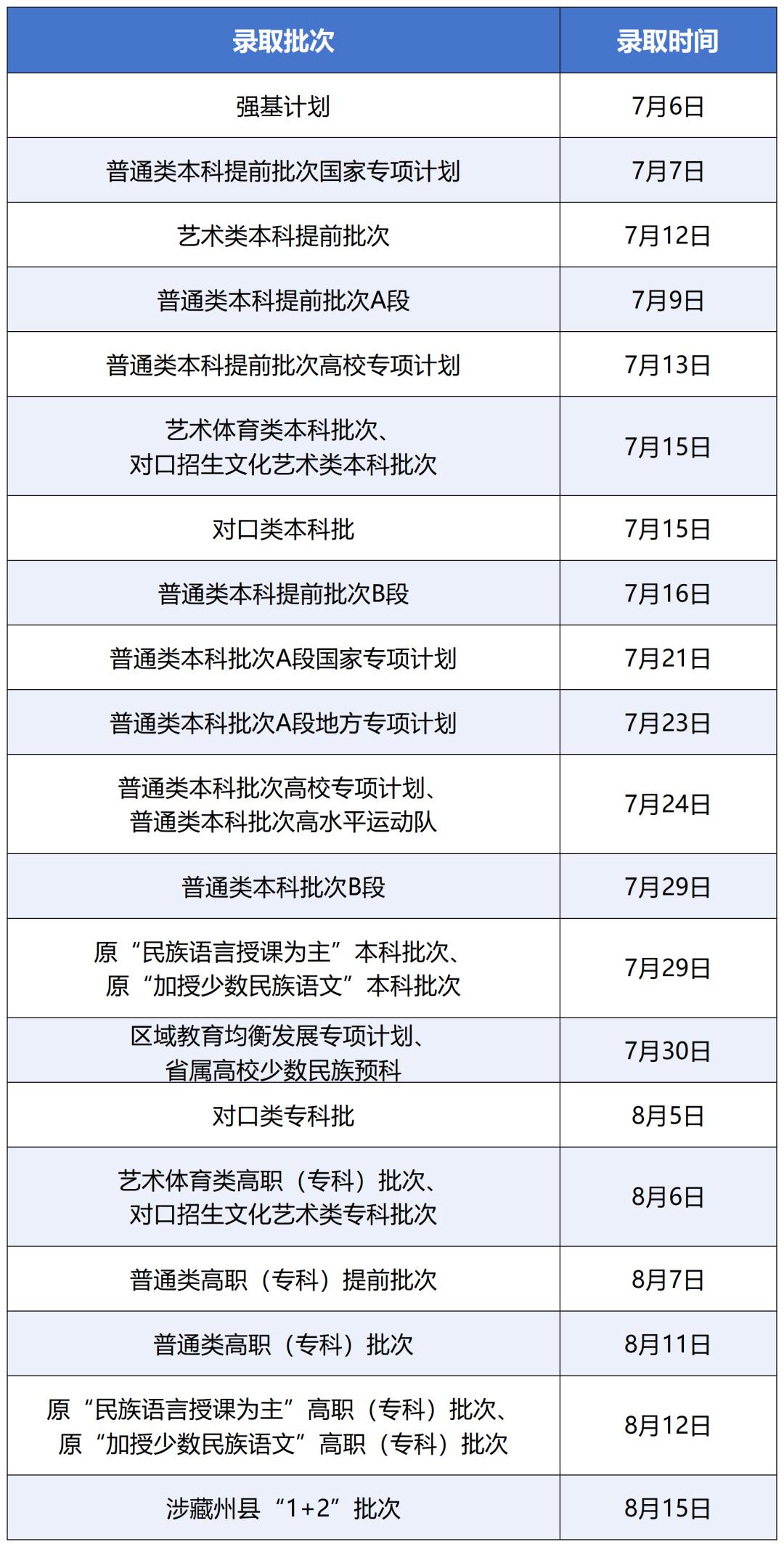 这里,特意为大家梳理了普通类主要批次的预计录取时间,如普通类本科提前批次B段、普通类本科批次B段、普通类高职(专科)提前批次、普通类高职(专科)批次的预计录取时间分别是7月16日、7月29日、8月7日、8月11日,建议大家及时关注。
