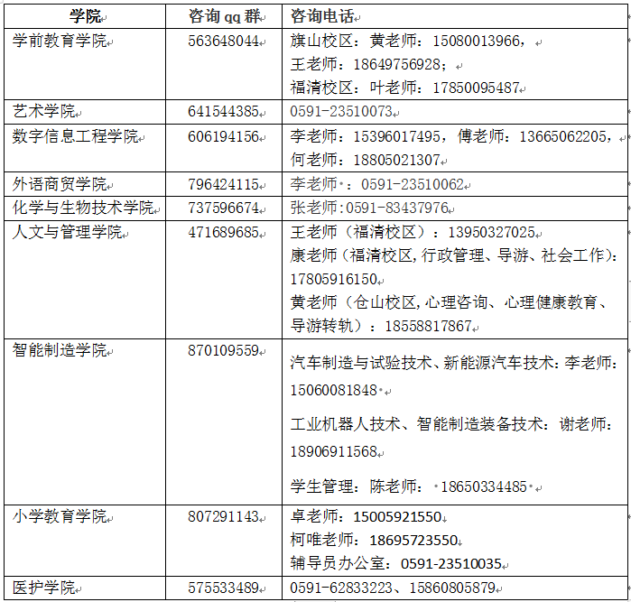心理咨询、心理健康教育、物联网应用技术、数字媒体技术、现代教育技术、大数据技术、信息安全技术应用、软件技术、汽车制造与试验技术、新能源汽车技术、工业机器人技术、智能制造装备技术、分析检验技术、食品药品监督管理、生物制药技术 | 仓山校区:福建省福州市仓山区城门镇城山100号 | |