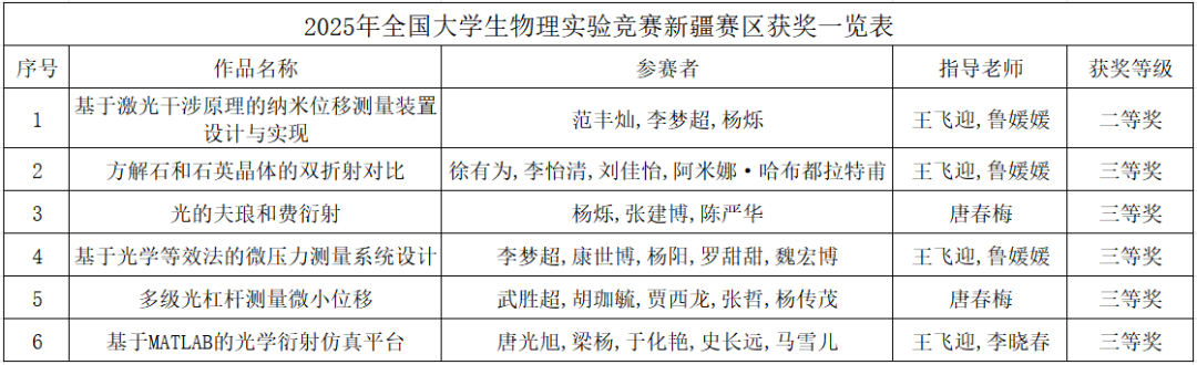 近日,由新疆大学承办的第十一届全国大学生物理实验竞赛(新疆赛区)及由陕西师范大学承办的第三届西北地区大学生物理实验竞赛圆满落幕。经过激烈角逐,我校化工与纺织工程学院教师指导的37名学生表现优异,共荣获二等奖4项、三等奖5项、优秀奖若干,王飞迎和鲁媛媛获评“优秀指导教师”,新疆科技学院荣获“优秀组织单位”称号。
