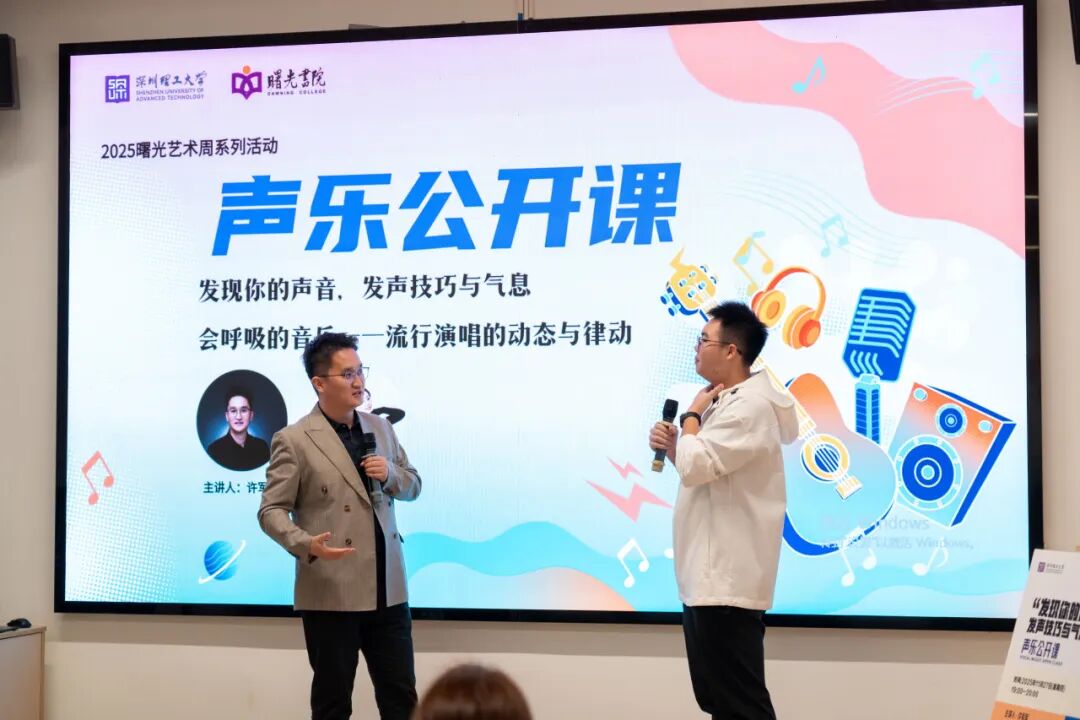 11月27日,两场高质量声乐公开课在曙光书院墨子厅接连开展。深圳歌剧舞剧院青年男高音歌唱家许军军带来《发现你的声音:发声技巧与气息》课程,他结合自身丰富的演出经验,通过现场示范指导,为同学们解决气息控制、发声位置等常见问题。