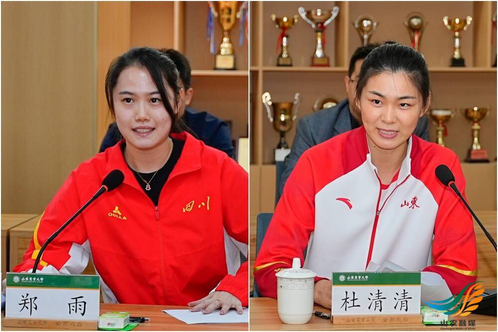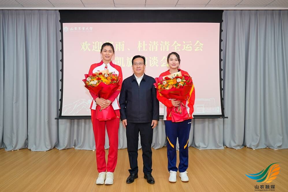座谈会上,郑雨和杜清清依次汇报了参加第十五届全运会的历程和感受。郑雨表示将牢记高校教师的职责,努力将体育的拼搏精神、团队的协作意识以及运动赛场的经历感悟,传递给更多学生,为学校体育文化建设、师生身心健康发展贡献力量。杜清清表示将课堂作为“新赛场”,把体育精神的种子播撒在学生心中,帮助他们成长为既有专业能力、又有健全人格的山农人,为学校培养“知农爱农、强农兴农”高素质人才贡献力量。