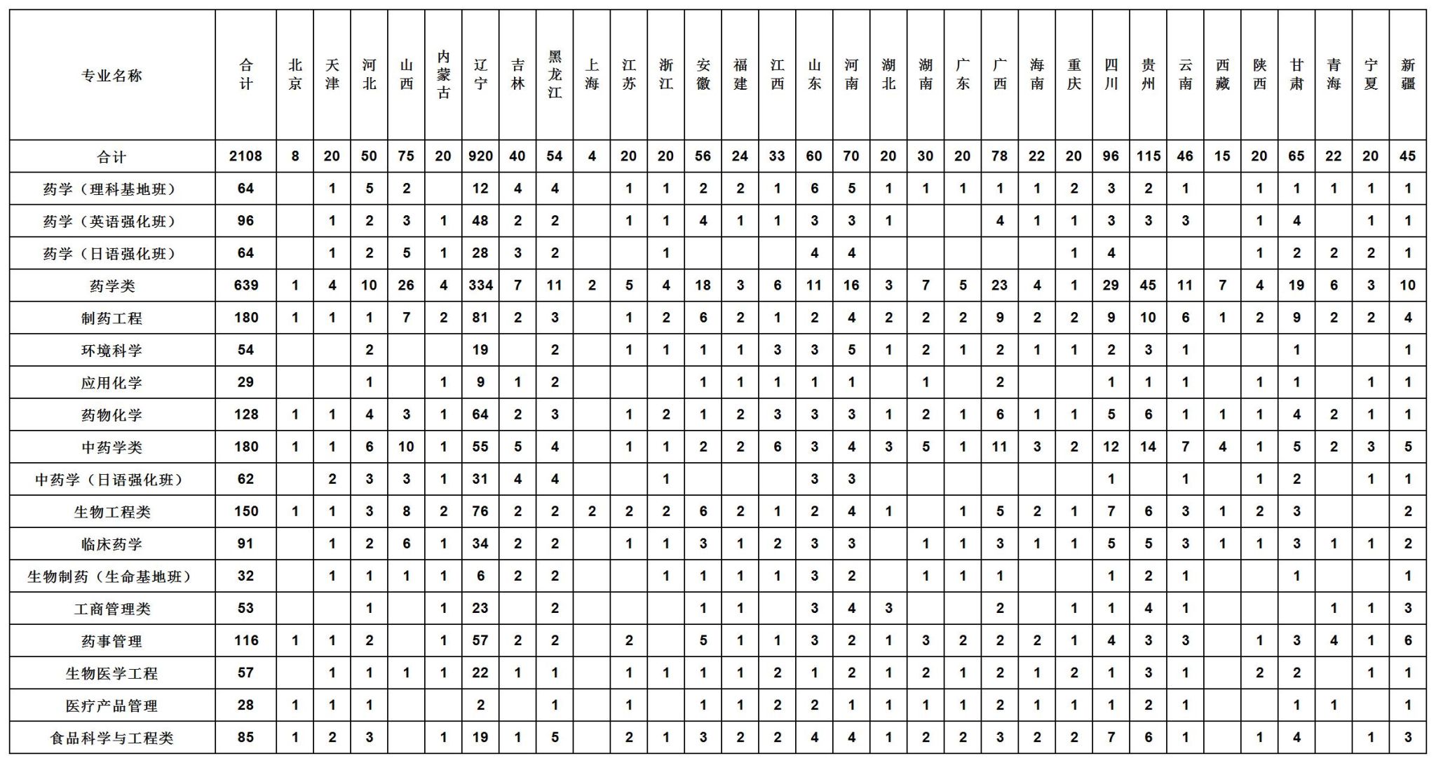 沈阳药科大学2020年招生计划