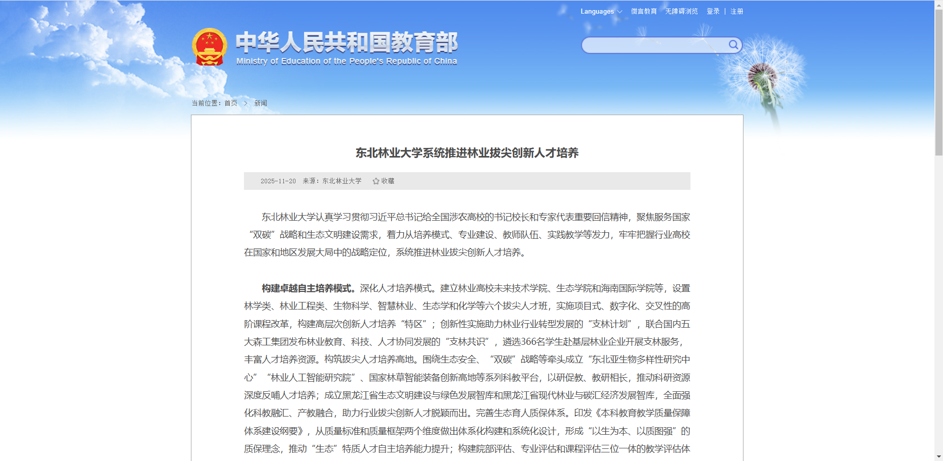 11月20日,教育部网站“战线联播”栏目以《东北林业大学系统推进林业拔尖创新人才培养》为题,报道了我校系统推进林业拔尖创新人才培养的相关工作。文章从构建卓越自主培养模式、推动专业内涵建设升级、强化教师教学能力提升和打造特色实践育人环节四个方面,介绍了我校相关典型经验做法及取得的工作成效。