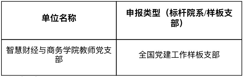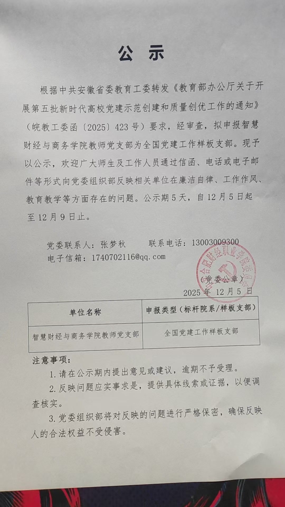 根据中共安徽省委教育工委转发《教育部办公厅关于开展第五批新时代高校党建示范创建和质量创优工作的通知》(皖教工委函〔2025〕423号)要求,经审查,拟申报智慧财经与商务学院教师党支部为全国党建工作样板支部。现予以公示,欢迎广大师生及工作人员通过信函、电话或电子邮件等形式向党委组织部反映相关单位在廉洁自律、工作作风、教育教学等方面存在的问题。公示期5天,自12月5日起至12月9日止。