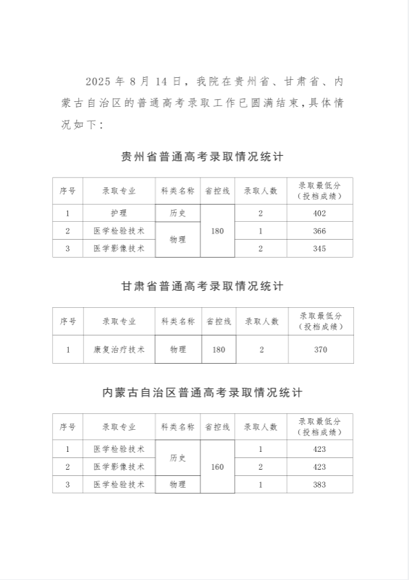 临汾职业技术学院2025年普通高考招生录取工作简报(贵州省、甘肃省、内蒙古自治区)