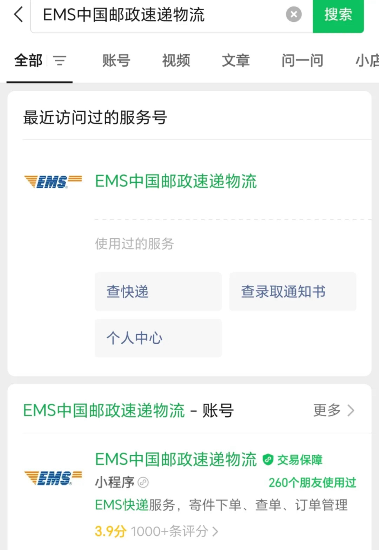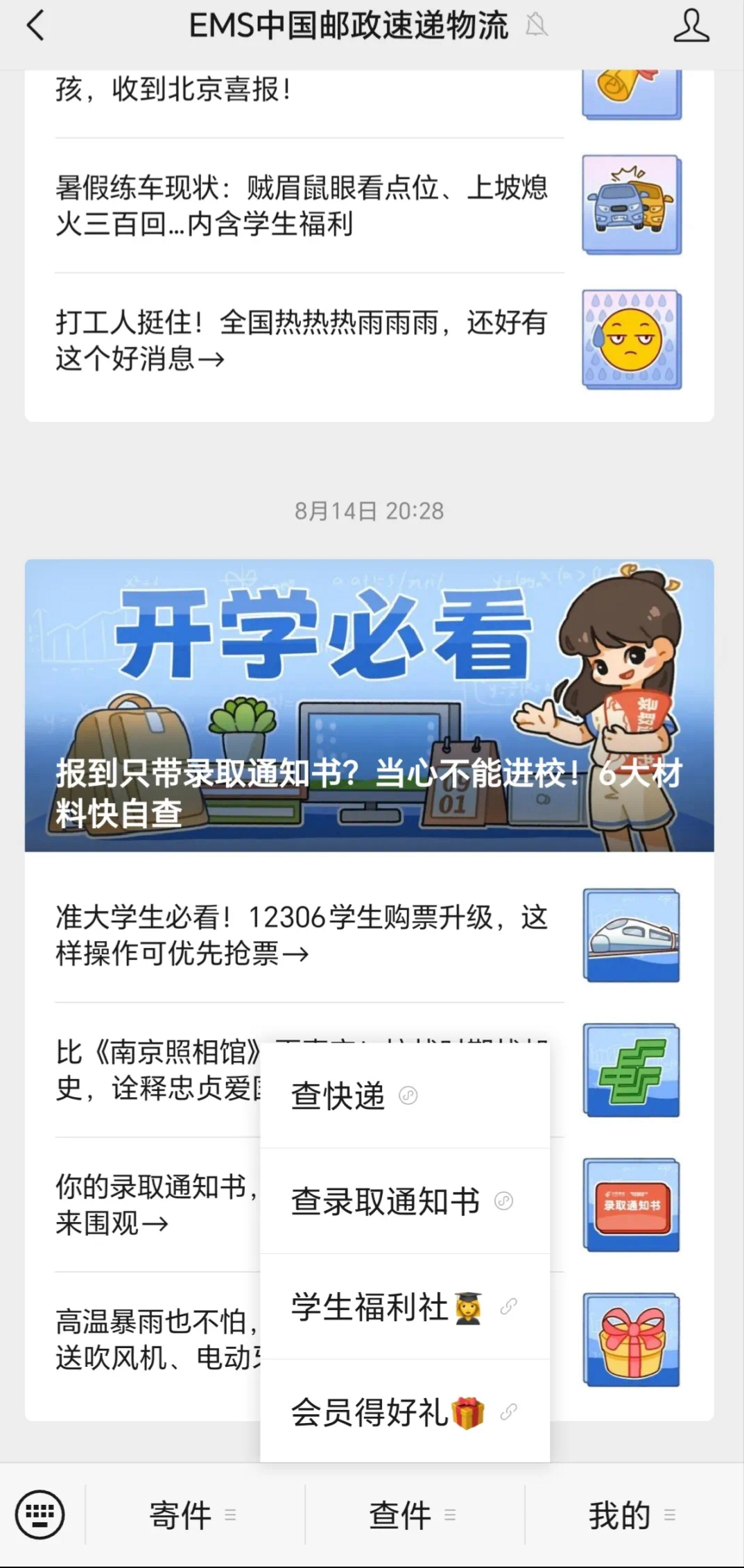 2. 关注物流信息:录取通知书寄出后,你可以通过微信搜索“EMS中国邮政速递物流”关注后进入公众号选择“查件”—“查录取通知书”,在考生邮件查询栏里输入考生号,可以查看你的通知书物流信息。
