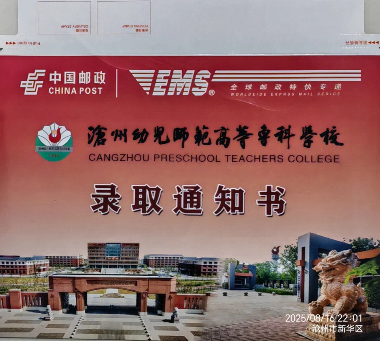 我们正式通知:沧州幼专2025级新生录取通知书将于2025年8月20日(星期三)统一通过邮政快递寄出!