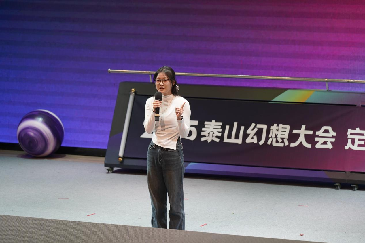 学生科幻联合会代表刘夏冰同学(五汶书院/艺术传媒学院)以“泰山脚下,星空之上”为题登上讲台,分享了自己的成长感悟。她表示,科幻是认知世界的独特透镜。蓬莱科幻学院(云端剧本杀学院)以“东方幻想王国”为定位,搭建跨界实践平台,使她收获了想象力与勇气、跨界智慧与文化自信,还深刻体会到科幻创作需兼具科技硬核与人文温度,更加坚定了以东方智慧讲述未来中国故事的信念。