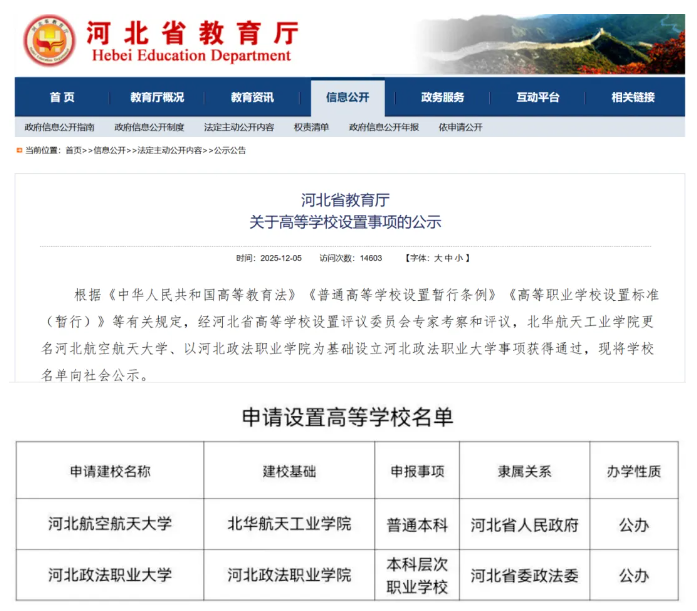 12月5日,河北省教育厅发布《关于高等学校设置事项的公示》,通过北华航天工业学院更名河北航空航天大学、以河北政法职业学院为基础设立河北政法职业大学,下为原文内容: