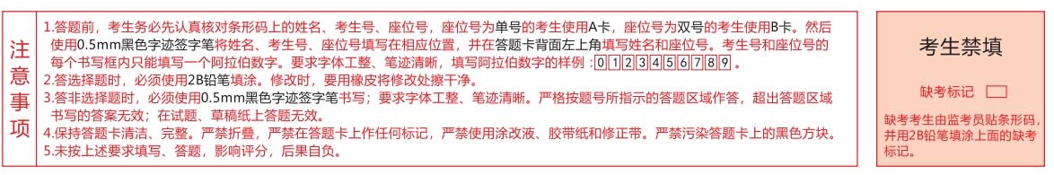 1.考生接到答题卡后,必须核对答题卡是否本场考试科目,张数和页码是否齐全,检查答题卡有无错发、漏印、重印、脏页、空白页、破损、字迹不清等问题。考试时,考生要检查答题卡类型是否和试卷类型一致,座位号是单号的考生要检查是否发的A题、A卡,座位号是双号的考生要检查是否发的B题、B卡。