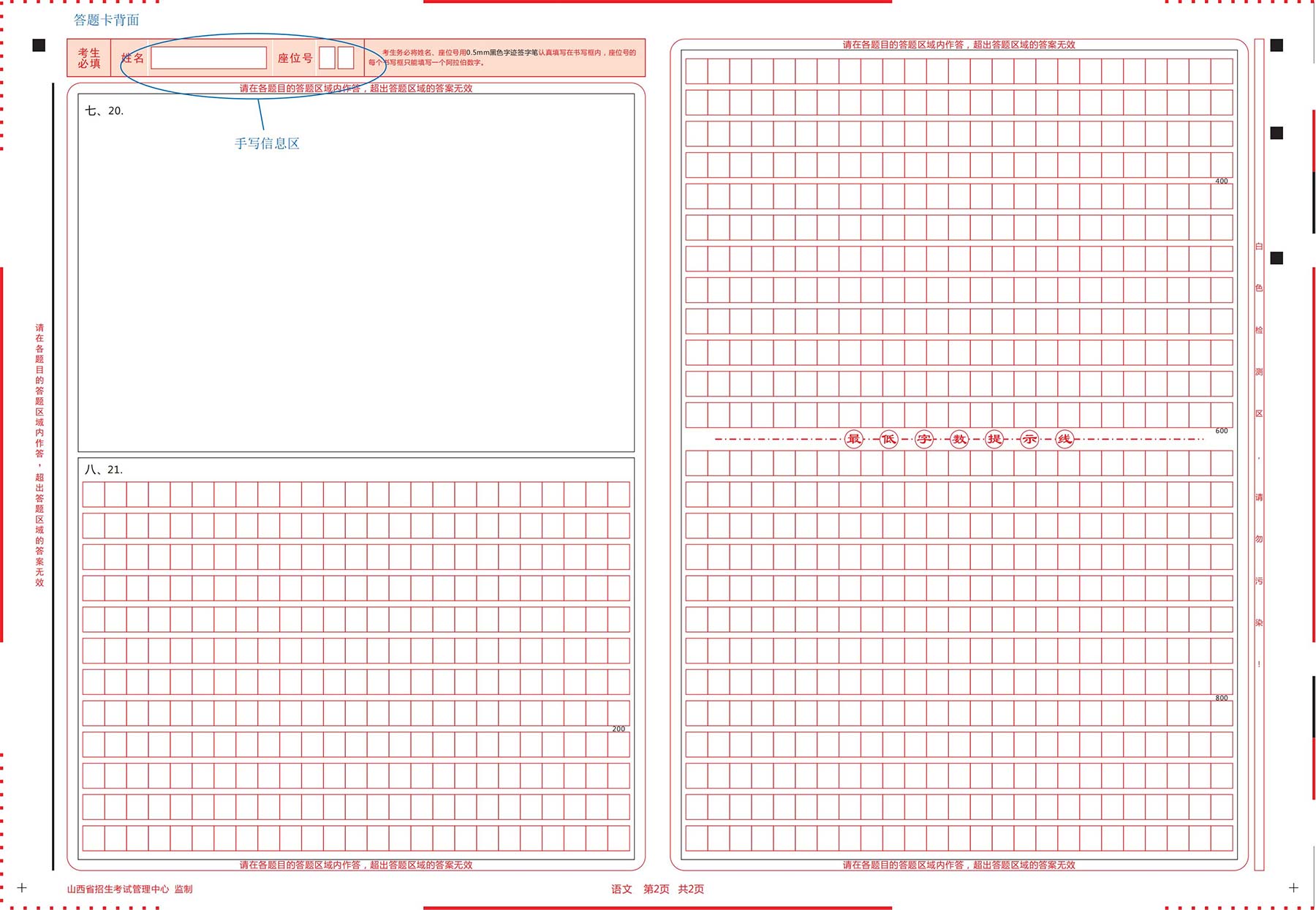 严禁考生本人填涂缺考标记。如有考生缺考,由监考员用0.5mm蓝色字迹签字笔填写正面手写区的姓名、考生号、座位号和背面卡头手写区的姓名、座位号,并在缺考标记区用2B铅笔涂黑缺考标记。