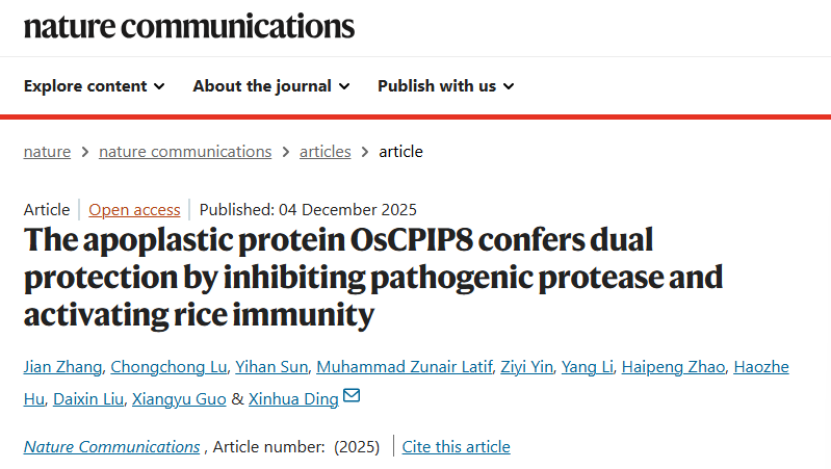 12月4日,山东农业大学植物保护学院丁新华教授团队在国际著名学术期刊《自然·通讯》(Nature Communications)发表了题为“The apoplastic protein OsCPlP8 confers dual protection by inhibiting pathogenic protease and activating rice immunity”的最新研究结果。该研究成功破解了植物早期免疫防御机制,全面系统揭示了植物细胞通过外泌防御性蛋白拮抗病原毒力,同时通过受体识别激活自身免疫的双重抗病机制,为抗病作物育种、免疫蛋白类生物农药研发奠定重要理论基础,对保障国家粮食安全、助力我国作物生产高质量发展具有重要意义。