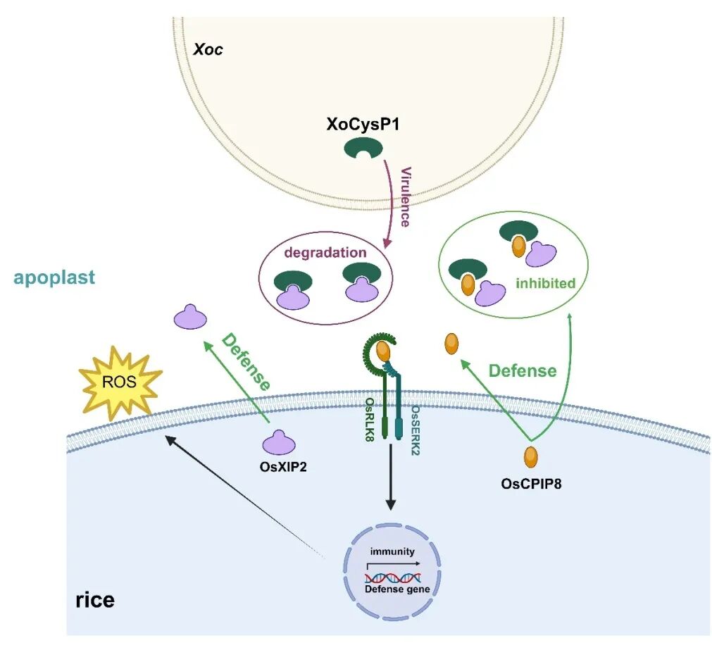 OsCPIP8的厉害之处远不止于此。团队进一步研究发现,OsCPIP8本身还是一个关键的“信号兵”。当OsCPIP8在质外体中识别XoCysP1的同时,会与细胞膜上的类受体激酶OsRLK8及其共受体OsSERK2互相识别,实现战场前沿(质外体)与指挥部(细胞核)的远距离通话,水稻细胞会立即激活水稻的基础免疫反应(ROS爆发、抗病蛋白基因表达等),让水稻进入全面戒备状态。这是水稻的第二重防御,团队将其比作“出兵讨贼,全面迎敌”。
