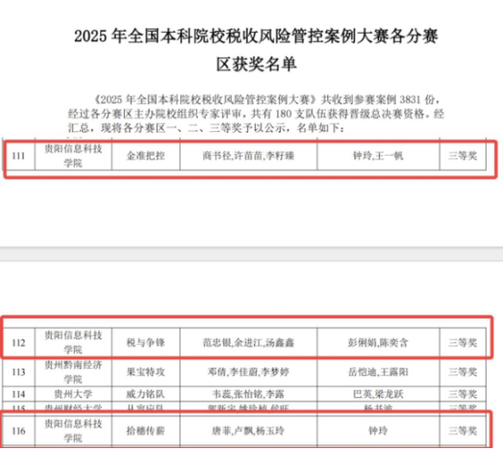 近日,2025年全国本科院校税收风险管控案例大赛分赛区评审结果正式揭晓。我校经济管理学院组建商书径团队(商书径、许苗苗、李籽臻)、范忠银团队(范忠银、余进江、汤鑫鑫)、唐菲团队(唐菲、卢飘、杨玉玲)3支参赛队伍,在钟玲、王一帆、彭俐娟、陈奕含等专业教师的悉心指导下,参赛学生凭借扎实的专业知识储备和出色的实践应用能力,从众多参赛队伍中脱颖而出,全部荣获贵州赛区三等奖,以亮眼成绩彰显了学校财税领域专业人才培养的显著成效。