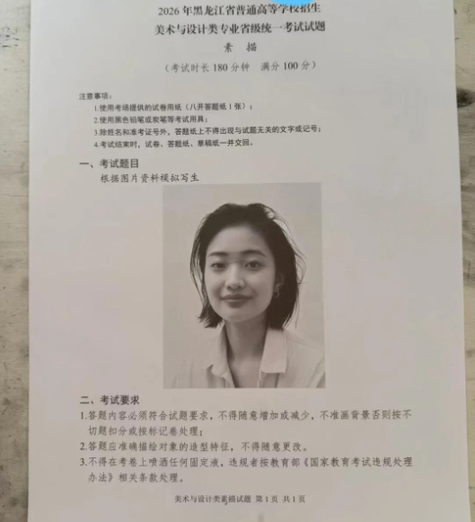 黑龙江2026年美术与设计类专业统考考题(素描)