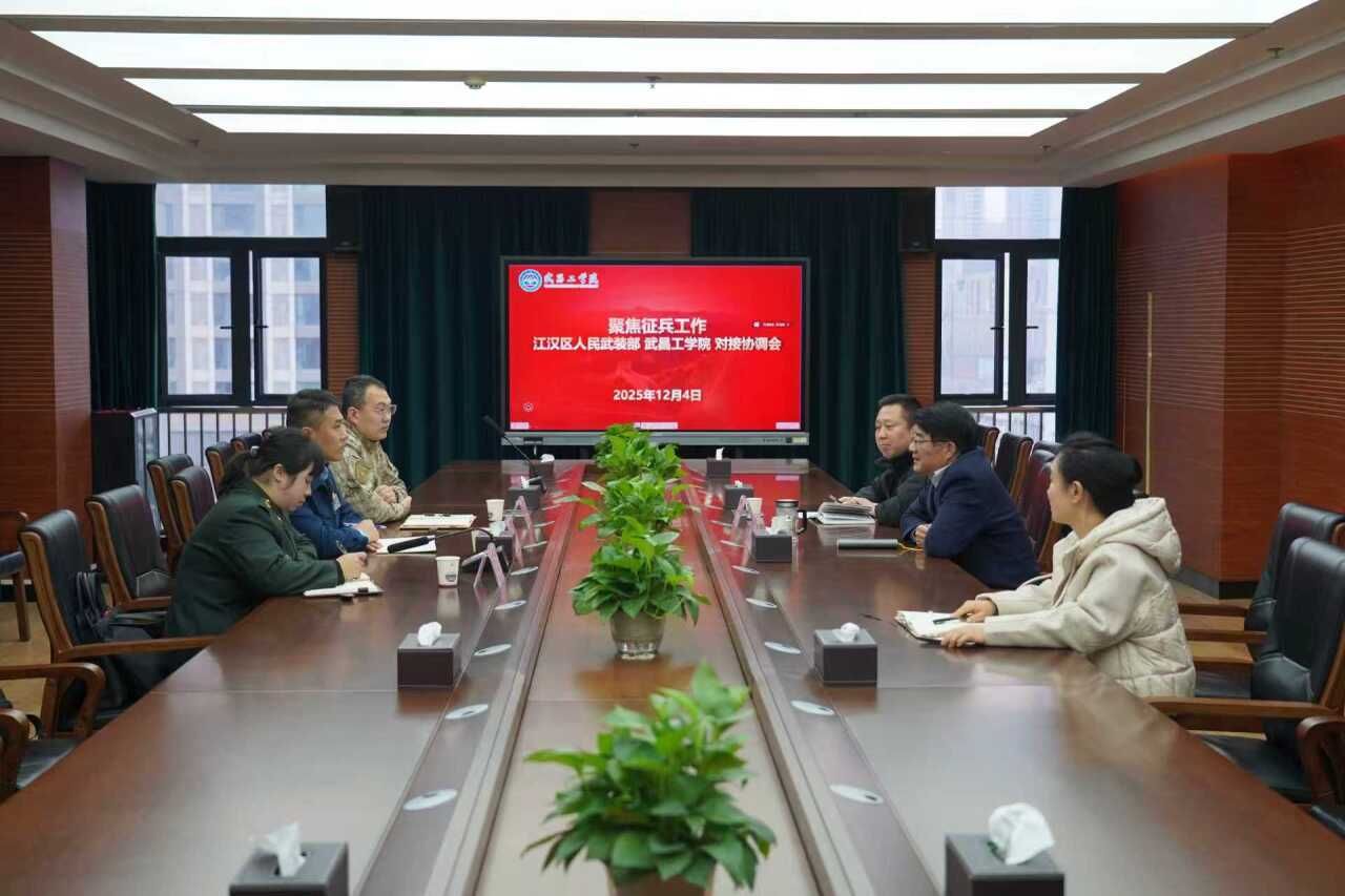 本网讯(通讯员 王博)12月4日,江汉区人民武装部政委闫潇、副部长郭佳一行来我校调研国防教育工作。副校长涂晓红、学生工作处副处长李洋出席座谈会。双方就深化校地协作、推动国防教育高质量发展进行深入交流。