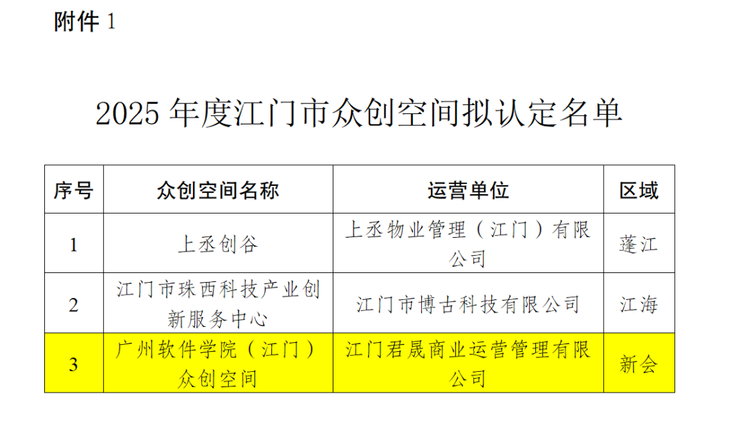广州软件学院(江门)众创空间于2025年4月成立,由江门君晟商业运营管理有限公司担任运营主体。众创空间现有运营场地面积492㎡,设有开放式办公区、会议室、路演厅及休闲交流区等多功能空间,已全部投入使用,并配备专门的管理机构、孵化场地、基础设施、专职管理人员、导师团队和专项经费。其中管理办公使用场地面积28平方米,常驻团队办公区使用面积208平方米,公共服务面积256平方米,可同时容纳34支创业团队开展创新创业活动。