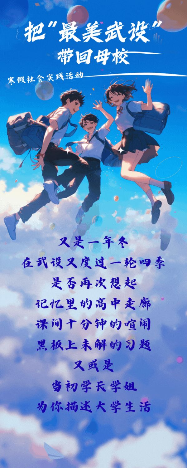 拟于12月下旬举行第四届“把最美武设带回母校”寒假社会实践项目启动仪式,具体通知请各团队密切关注活动QQ群(群号:690942679)。