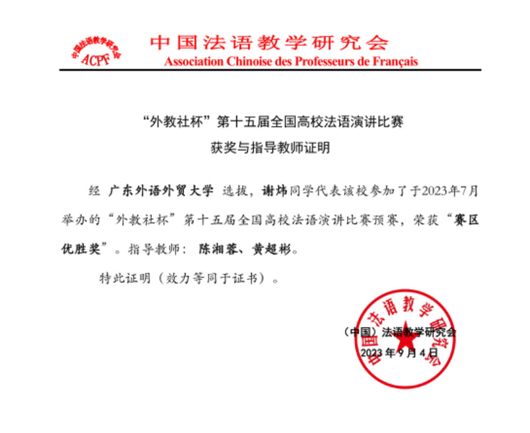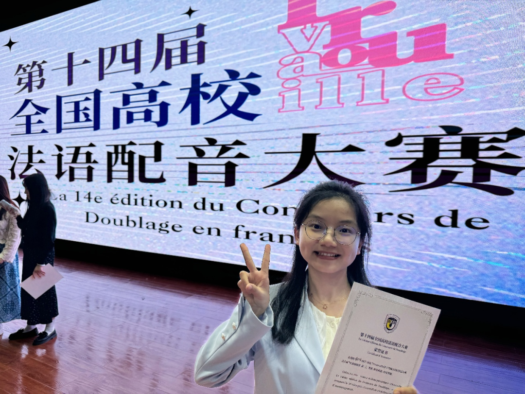 获第三十五届韩素音国际翻译大赛法译汉优秀奖、 “外教社杯”第十五届全国高校法语演讲比赛优胜奖、第十四届全国高校法语配音大赛全国决赛三等奖