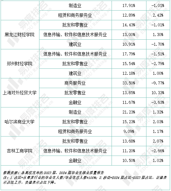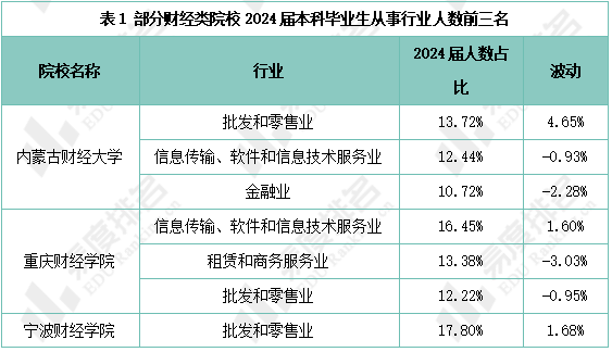 受金融市场波动影响,财经类毕业生就业呈现多元化趋势。批发零售业及信息传输、软件和信息技术服务业等行业的人数占比上升,上榜多数财经类院校的行业就业人数前三名。金融业虽仍为重要就业领域,但已非主导选择。