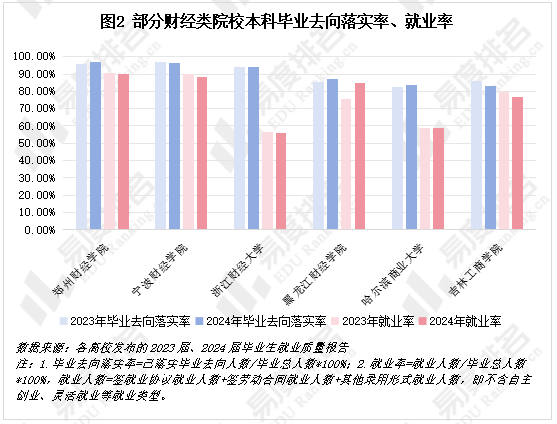 在公布相关数据的部分财经类院校中,毕业去向落实率整体稳定,普遍维持在80%以上。其中,郑州财经学院、宁波财经学院及浙江财经大学超过90%,黑龙江财经学院、哈尔滨商业大学、吉林工商学院等东北地区院校则相对偏低,反映财经领域毕业难易度存在地域差异。