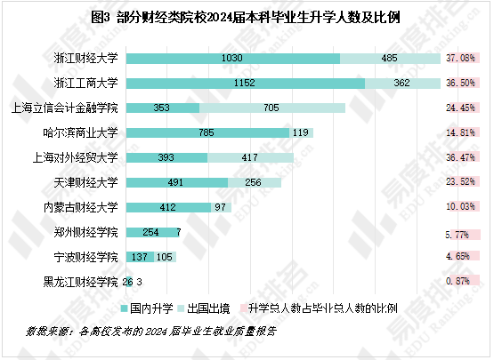 升学数据验证了前文所述“毕业生通过升学暂缓就业压力”的推论:数据显示,浙江财经大学与哈尔滨商业大学升学人数及占比确实居于前列。从区域分布看,浙江、上海等地院校毕业生升学占比显著高于其他地区,反映区域经济发达程度与毕业生教育投入意愿呈正相关。