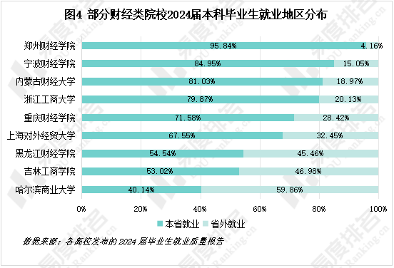 地方财经类院校毕业生以本地生源为主,且在地方就业市场具有较强影响力,故多数院校本科毕业生省内就业比例高于省外,中部、东部地区尤为显著。例外情况见于哈尔滨商业大学、吉林工商学院及黑龙江财经学院,其省外就业人数接近或超过省内,或与东北地区财经行业发展现状有关,促使毕业生向需求更旺盛区域流动。