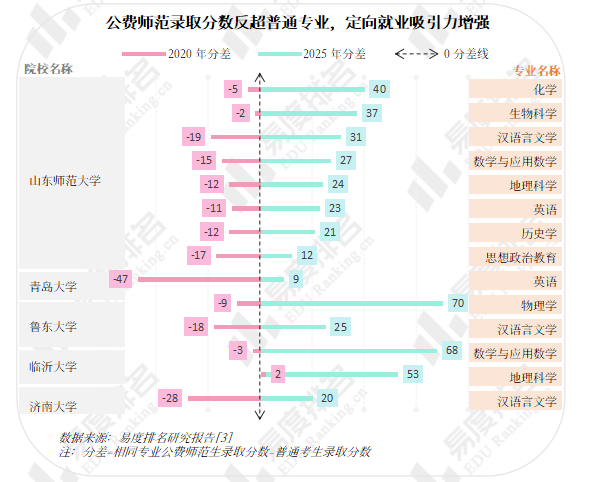 地域差距弱化趋势在一些定向培养项目上也得到验证。例如,在山东招生的师范类高校中,公费师范生录取分数2020年还普遍低于普通专业,今年已大大反超,最大超出分差达70分,公费农科、公费