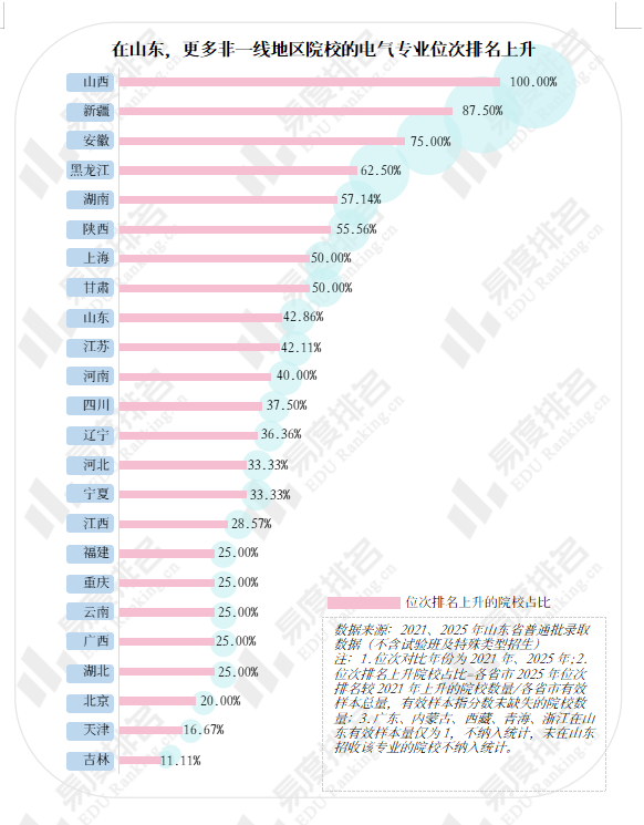 通过对比排名上涨院校的省份分布情况,可以观察到显著的区域差异:山西、新疆、安徽、黑龙江、湖南等中西部及东北地区省份有更高比例院校实现了位次排名的上升,超过北上广及江浙地区,而天津、北京两地排名上升的院校占比均未超过20%,意味着这些地区有更多院校的生源吸引力降低。