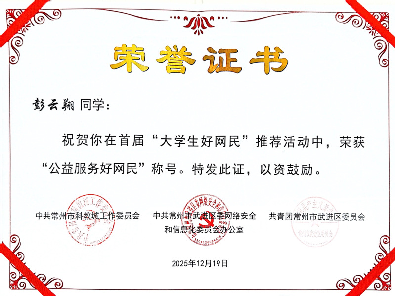 12月19日,由常州市委网信办、常州科教城党工委、武进区委网信办、武进团区委联合主办的“青春有我”2025首届大学生好网民风采展示活动在常州大学西太湖校区圆满落幕。我校旅游与康养学院杜坤、信息工程学院彭云翔两位同学脱颖而出,分别获评“正能量传播好网民”与“公益服务好网民”,充分展现了我校学子积极健康、向上向善的网络正能量形象。