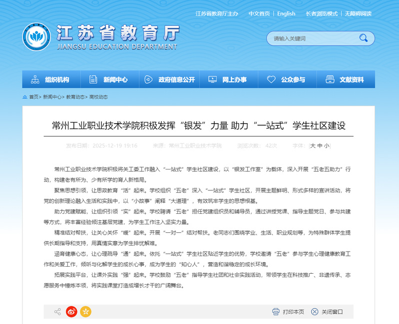 江苏省教育厅:常州工业职业技术学院积极发挥“银发”力量 助力“一站式”学生社区建设