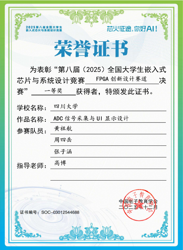 近日,第八届(2025)全国大学生嵌入式芯片与系统设计竞赛 FPGA 创新设计赛道全国总决赛在南京圆满落幕。本届赛事共吸引全国 342所院校3901支队伍、超万名学子同台竞技,决赛通过率仅15%,竞争异常激烈。我校物理学院2023级本科生团队,黄祖航、周四岳、张子涵,由高博老师指导,凭借扎实的专业功底与创新实践能力脱颖而出,斩获全国一等奖1项。