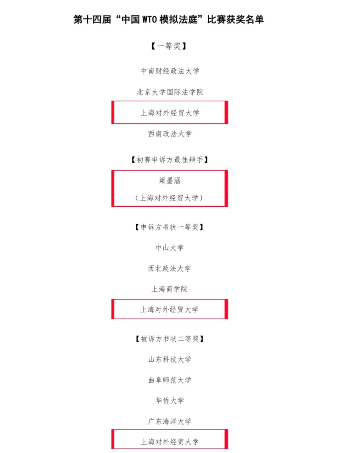 近日,第十四届“中国WTO模拟法庭”竞赛(China WTO Moot Court Competition)在西南政法大学顺利举行。经过书状评审、线上初赛、线下多轮角逐,我校代表队从全国66支高校队伍中脱颖而出,与北京大学、中山大学、山东大学、西南政法大学、北京外国语大学等十所院校共同斩获团体全国一等奖以及申诉方书状一等奖和被诉方书状二等奖,其中2024级国际经贸规则专业梁墨涵获得初赛申诉方“最佳辩手”的荣誉,充分展现了我校在WTO法领域的人才培养实力。
