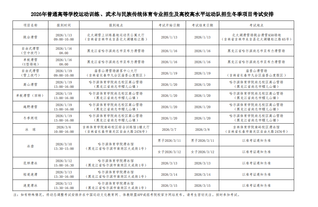 2026年普通高等学校运动训练、武术与民族传统体育专业招生及高校高水平运动队招生冬季项目考试安排
