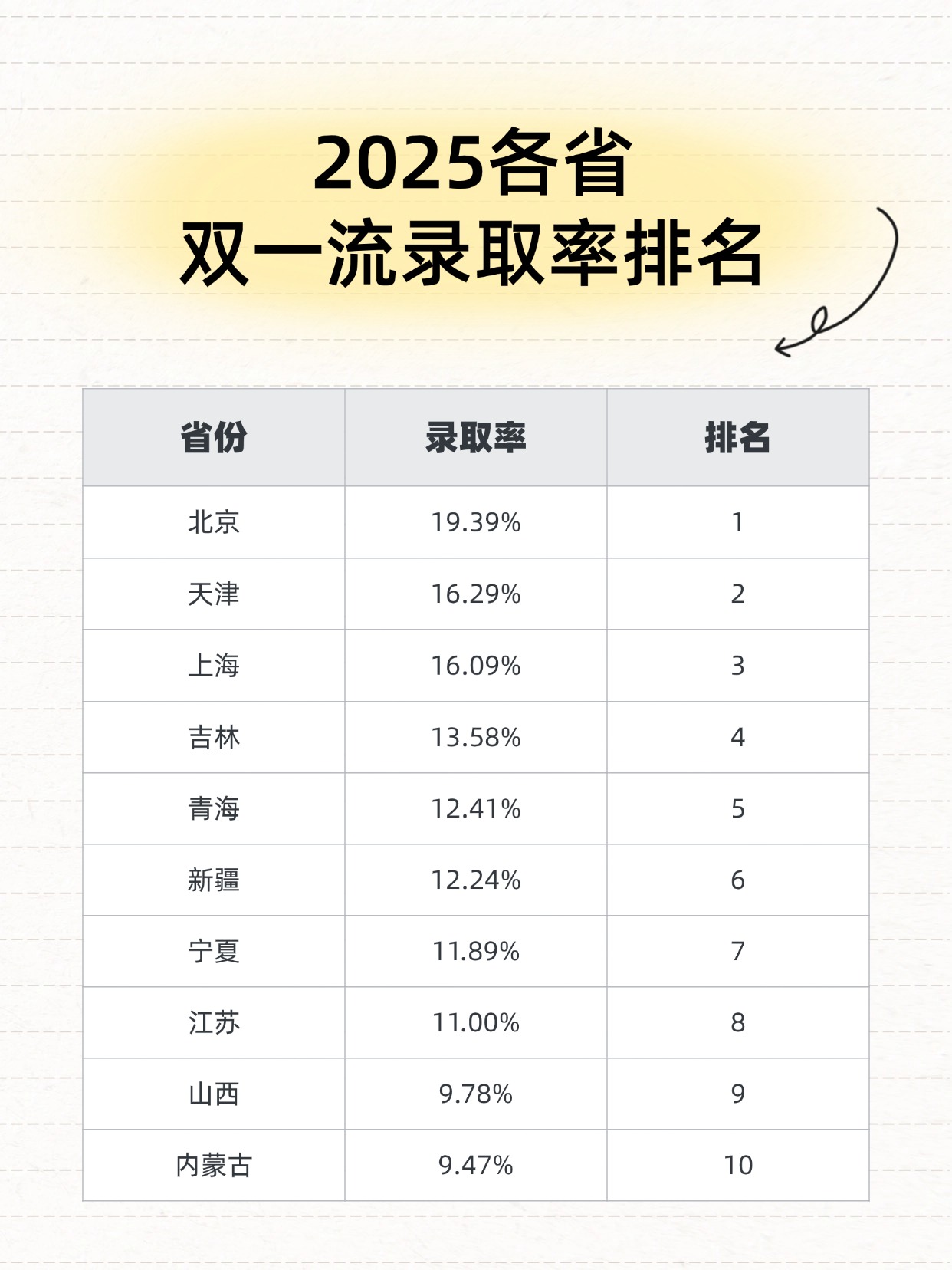 北京双一流及以上院校录取率均为全国第一,拥有较大的优势。新疆、宁夏、青海等省份排名也相对靠前,甚至超过了许多东部教育强省。这在一定程度上能看出国家招生政策对中西部和边疆地区的倾斜与扶持,使得这些地区的考生在争取顶尖资源时拥有更宽松的通道。