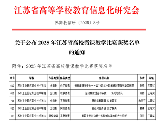 近日,由江苏省教育厅指导、江苏省高等学校教育信息化研究会主办的2025年江苏省高等学校微课教学比赛获奖名单正式公布。我校报送的5项作品喜获佳绩,荣获二等奖1项、三等奖4项(含继续教育组1项)。
