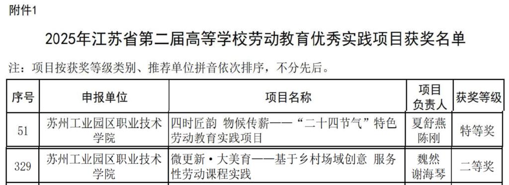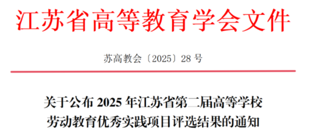 近日,江苏省高等教育学会公布了2025年江苏省第二届高等学校劳动教育优秀实践项目评选结果,我校申报的两个项目双双获奖。其中,夏舒燕、陈刚老师申报的《四时匠韵、物候传薪一一“二十四节气”特色劳动教育实践项目》获得特等奖,魏然、谢海琴老师申报的《微更新·大美育一一基于乡村场域创意、服务性劳动课程实践》获得二等奖。