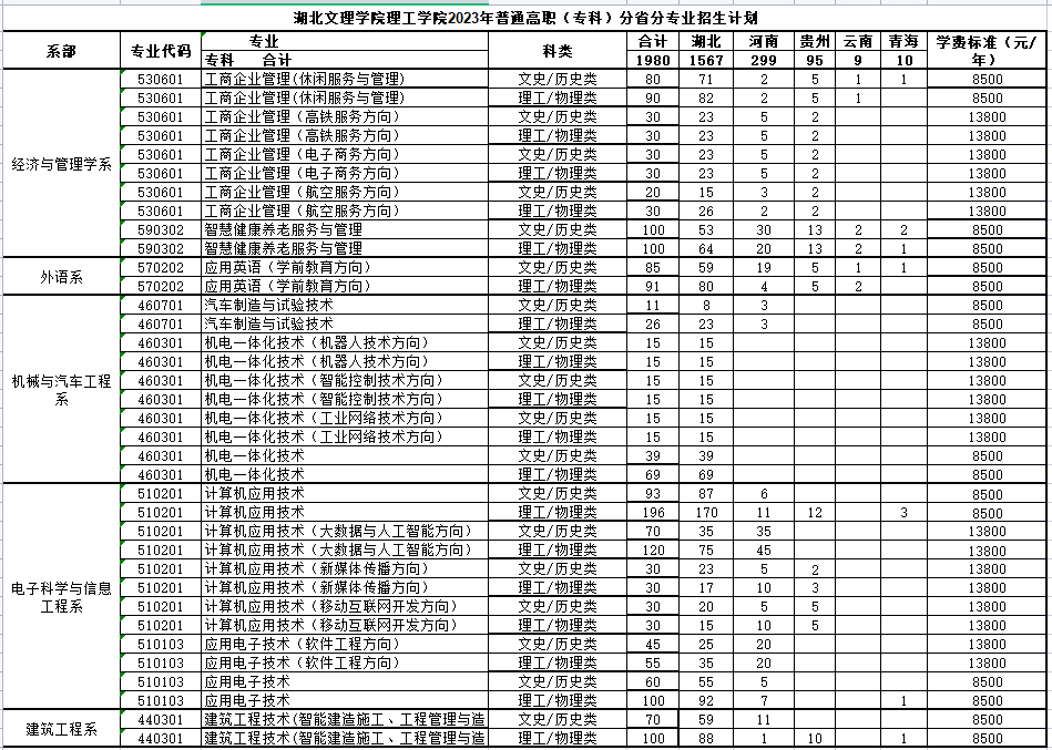 湖北文理学院理工学院2023年普通高职(专科)分省分专业招生计划