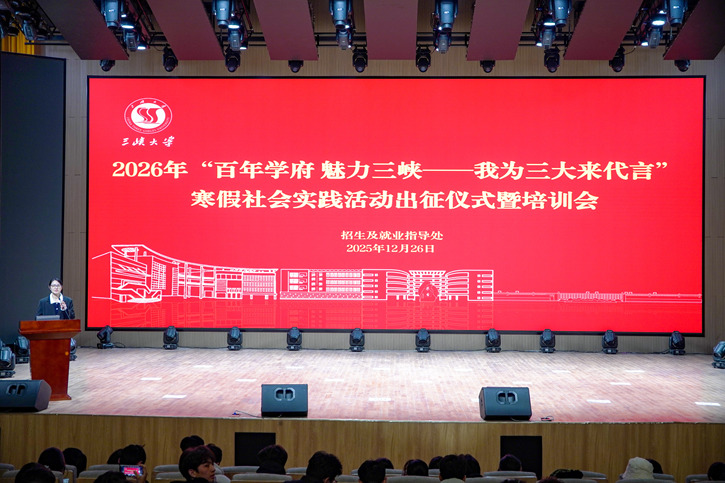 本网讯(通讯员 李盼)12月26日,2026年“百年学府 魅力三峡——我为三大来代言”寒假社会实践活动出征仪式暨培训会在生材楼1号厅举行。学校招就处处长封林、各学院教师代表、招生办公室全体人员以及七百余名学生参与本次大会。大会由招就处副处长刘垚主持。