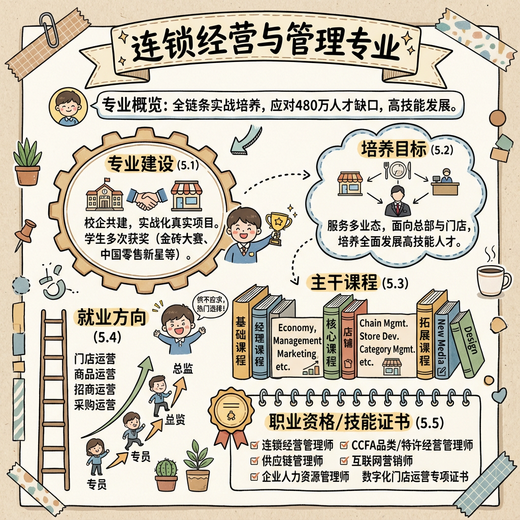 专业核心课程:连锁经营管理实务、连锁门店开发与设计、门店营运实务、品类管理、特许经营实务、连锁企业ERP软件管理实务、采购与供应链管理、商务谈判与推销技巧