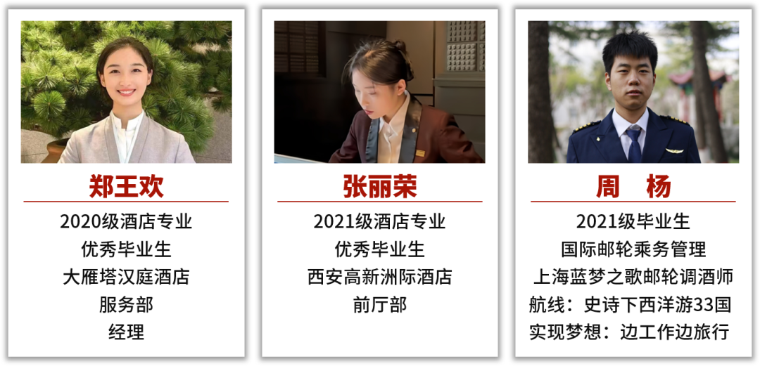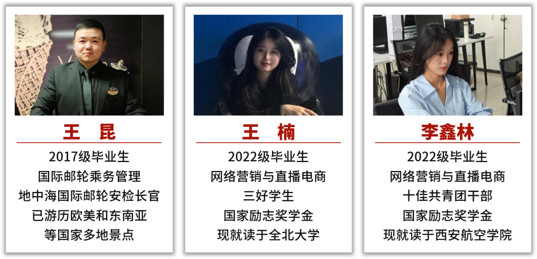 就业方向:本专业就业主要面向国内外一流的国际邮轮公司,2021级至2023级学生的实习就业目前遍布招商局邮轮制造有限公司大湾区邮轮、香港云顶集团名胜世界邮轮、嘉年华集团歌诗达邮轮、天津东方国际邮轮有限公司东方梦想号、上海蓝梦之歌国际邮轮股份有限公司蓝梦之歌邮轮及重庆冠达集团旗下各个游轮。