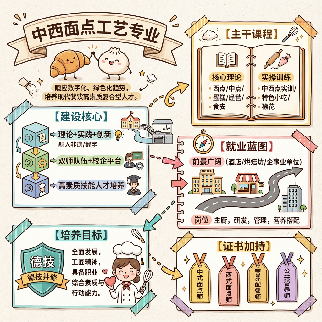 中西面点工艺专业顺应现代餐饮行业数字化、网络化、智能化、绿色化发展的新趋势,对接新产业、新业态、新模式下面点制作、厨房运行等岗位(群)的新要求,不断满足现代餐饮行业高质量发展对高素质技能人才的需求,推动职业教育专业升级和数字化改造,提高人才培养质量。